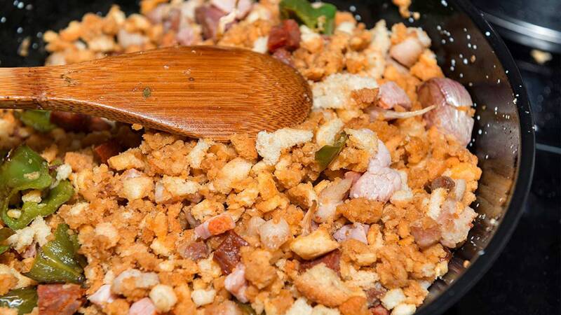 Algo fundamental antes de empezar a cocinar, es tener en cuenta que el pan que utilicemos tiene que estar duro, lo suficiente para que lo podamos cortar con un cuchillo de sierra. Tenemos que conseguir unas rebanadas lo más finas posibles. Después de cortar el pan, se recomienda humedecerlo un poco para que las migas queden lo más jugosa posibles.