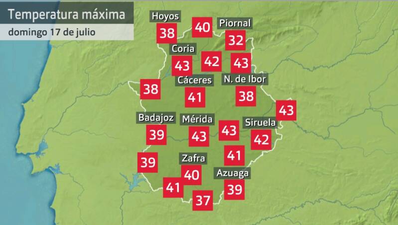 Hoy nos hemos quedado por debajo de los 40 ºC en esas localidades, pero aún sigue haciendo calor por el este. Hasta 43 ºC han marcado los termómetros en Don Benito, en Navalmoral de la Mata y en Herrera del Duque.